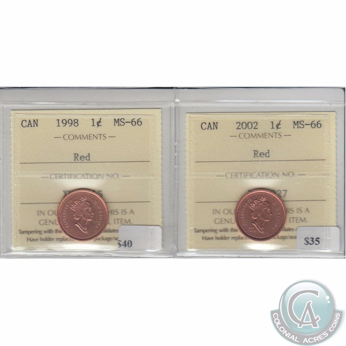 1998 & 2002 Canada 1-cents All ICCS Certified MS-66; Red (2pcs)