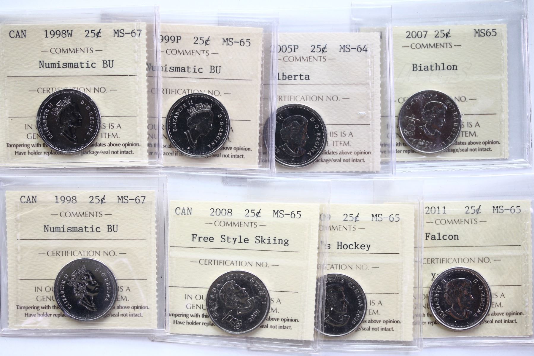 1998 25¢ to 2011 ICCS Gem Mint State-65 to Superb Gem Mint State-67NBU. Lot of 8 ICCS graded coins.
