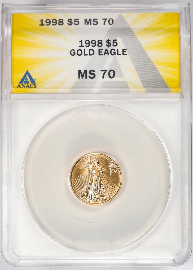 One 1998 $5 American Gold Eagle Coin ANACS MS70. ANACS Certified.