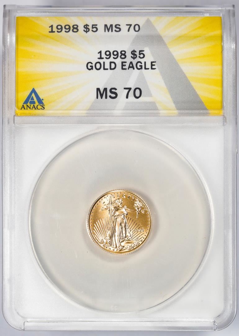 One 1998 $5 American Gold Eagle Coin ANACS MS70. ANACS Certified.