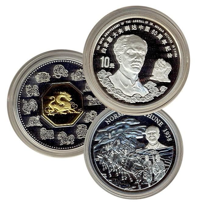 1998 $5 Norman Bethune Coin set & 2000 $15 Proof silver Dragon Lunar Coin. Both come in there original box.