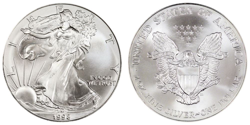 One 1998 American Silver Eagle .999 Fine Silver Dollar Coin. A great addition to any beginner or advanced coin collector's collection!