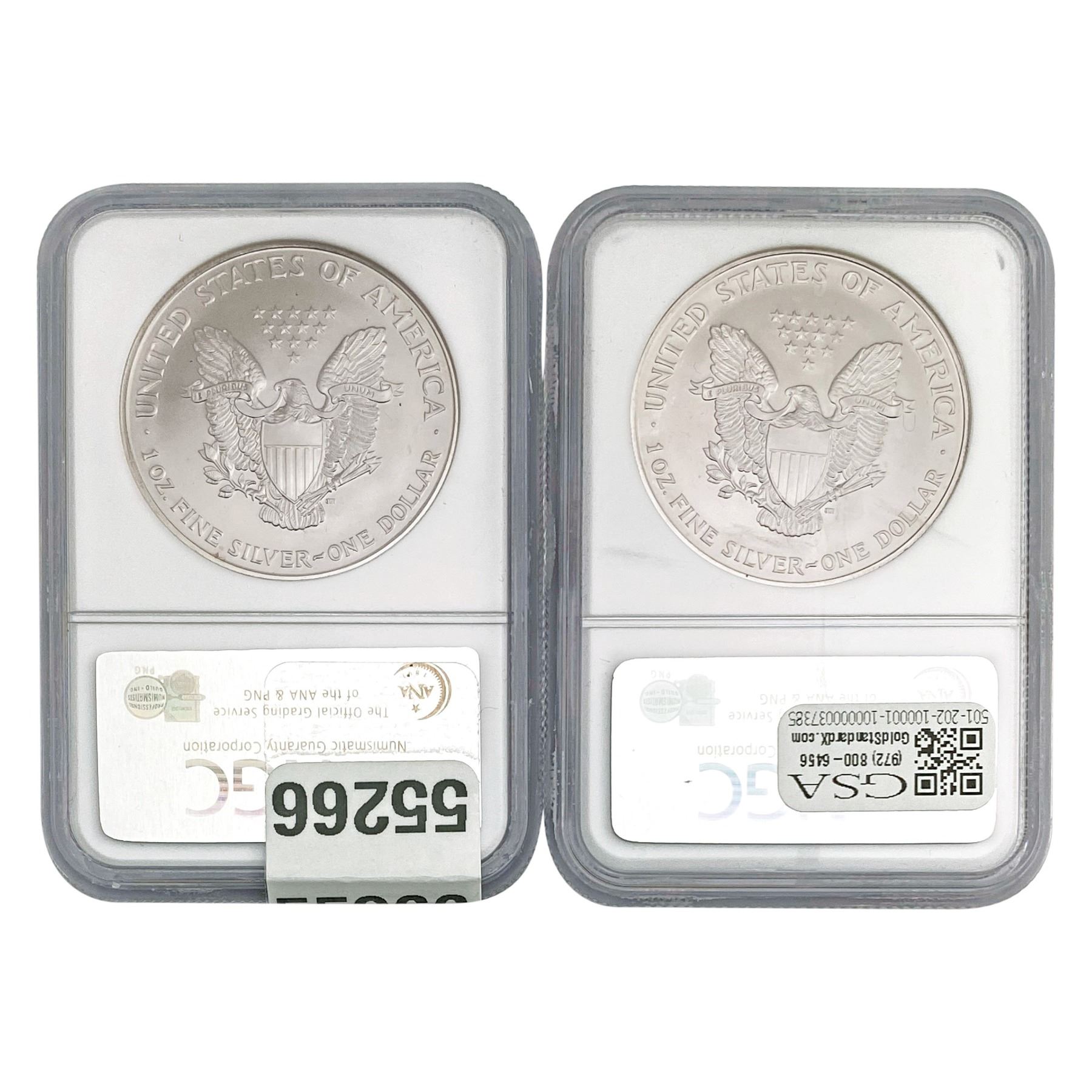 e. Coins sold referencing a third-party grading service are sold “AS IS” without any express or implied warranty, except for a guarantee by GSA that they are genuine. Removal or alteration of the holder, voids all of Bidder’s claims concerning that Product. Certain warranties may be available from the grading services and Bidders are referred to them for further details: Numismatic Guaranty Corporation (NGC), PO Box 4776, Sarasota, FL 34230, www.ngccoin.com/services/writtenguarantee.asp; Professional Coin Grading Services (PCGS), PO Box 9458, Newport Beach, CA 92658, www.pcgs.com/guarantee.html; ANACS, 6555 S. Kenton St., Ste. 303, Englewood, CO 80111; and Independent Coin Grading Co. (ICG), 7901 East Bellview, Ave., Suite 50, Englewood, CO 80111.