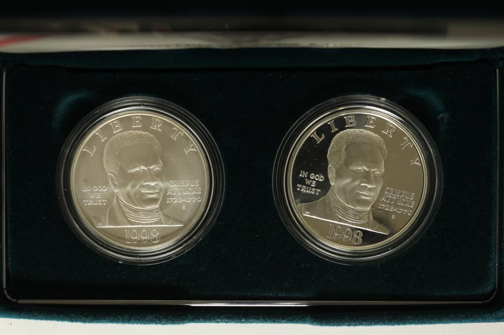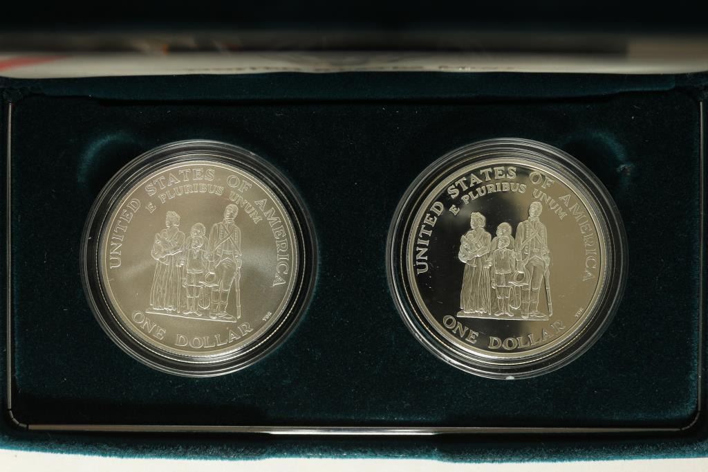 COMMEMORATIVE SILVER DOLLAR PROOF AND UNC COIN SET, ORIGINAL US MINT PACKAGING, 2021 REDBOOK RETAIL IS $125.00