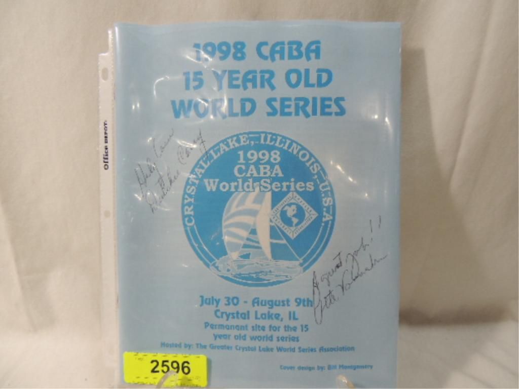 1998 CABA 15 YEAR OLD WORLD SERIES PROGRAM SIGNED BY DUTCHIE CARAY AND PETE VONACHEN. AS SHOWN. SEE PHOTO FOR MORE DETAILS. PLEASE BE ADVISED, AND INFORMED REGARDING SIGNATURES OR AUTOGRAPHS THAT WE SELL AT AUCTION: WE ARE NOT AUTHENTICATORS, AND WE DO NOT AUTHENTICATE, OR VALIDATE ANY AUTOGRAPHS OR SIGNATURES THAT WE OFFER AT AUCTION. SOME AUTOGRAPHS OR SIGNATURES MAY COME WITH AN AUTHENTICATION FROM ANY ONE OF LITERALLY HUNDREDS OF AUTHENTICATORS ACROSS THE COUNTRY, AND AROUND THE WORLD. WE DO NOT ENDORSE ANY AUTHENTICATOR, NOR DO WE GUARANTEE THAT ANY AUTOGRAPH OR SIGNATURE IS AUTHENTIC, OR THAT IT WILL PASS AUTHENTICATION BY ANY AUTHENTICATOR. ALL AUTOGRAPHS OR SIGNATURES ARE SOLD