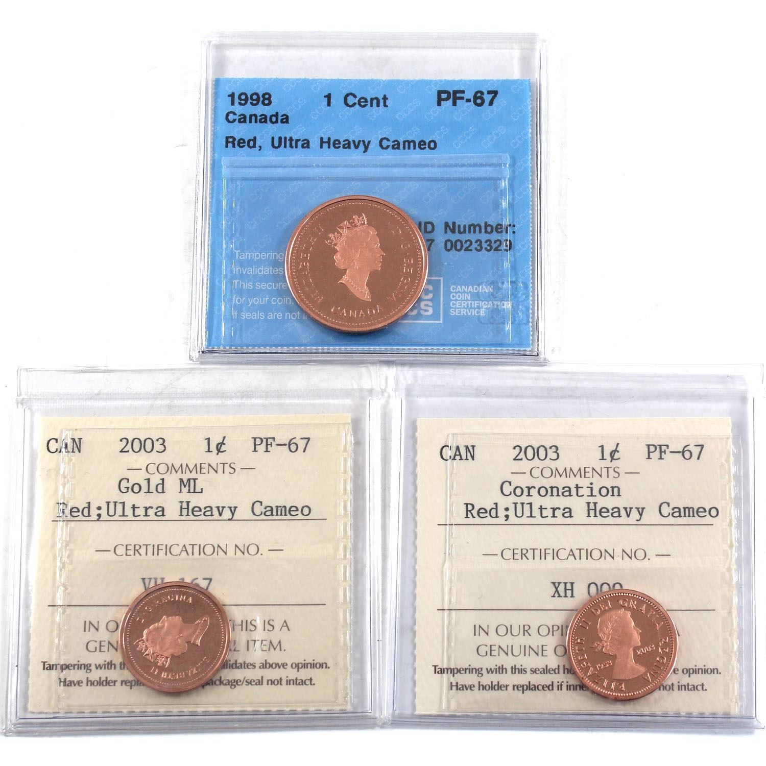 1998 CCCS & 2x 2003 ICCS Canada Commemorative 1-cent Certified PF-67 Red Ultra Heavy Cameo. 1908-1998 Commemorative, 2003 Gold Maple Leaf, & 2003 Coronation. 3pcs