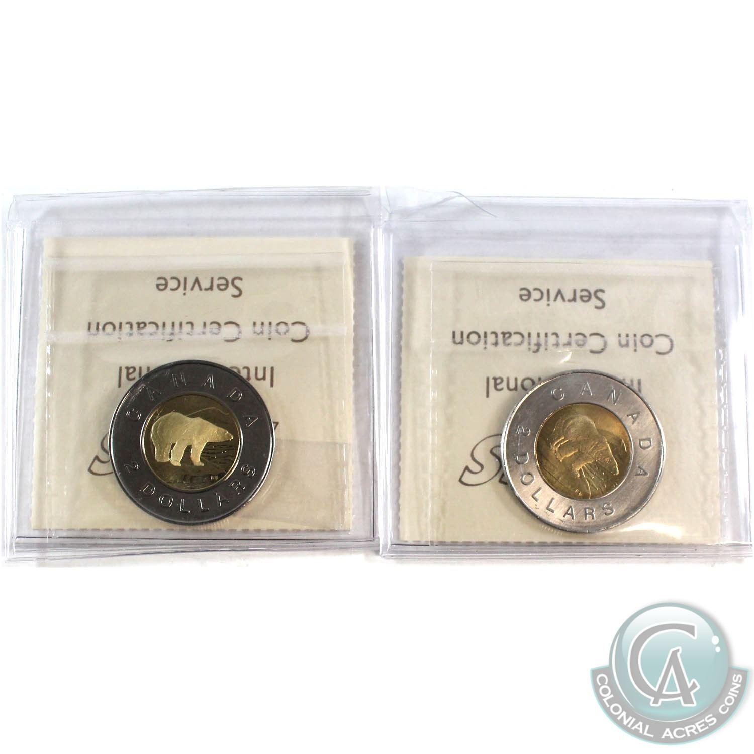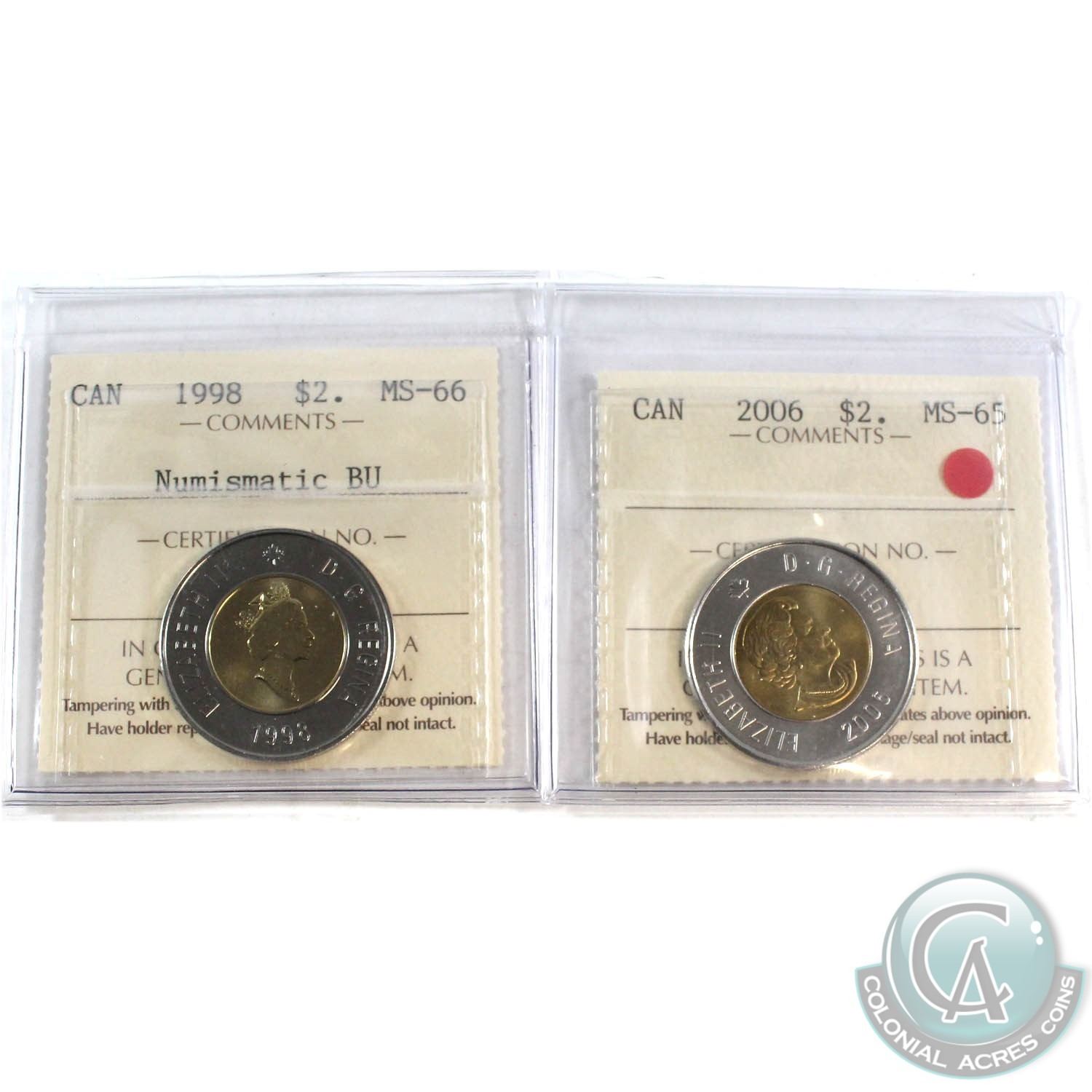 1998 Canada $2 ICCS Certified MS-66 NBU & 2006 Canada $1 ICCS Certified MS-65. 2pcs.