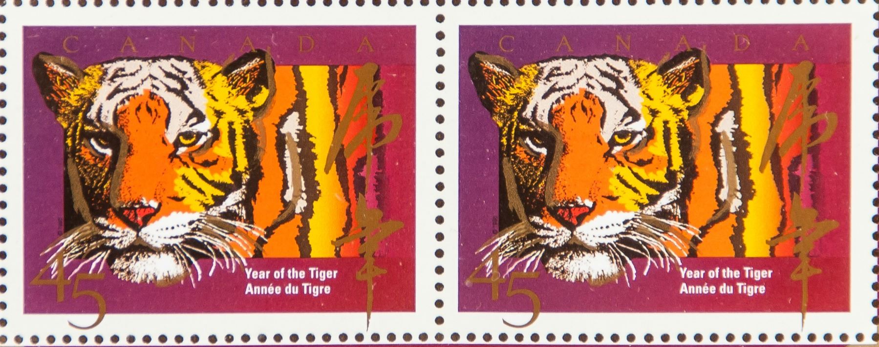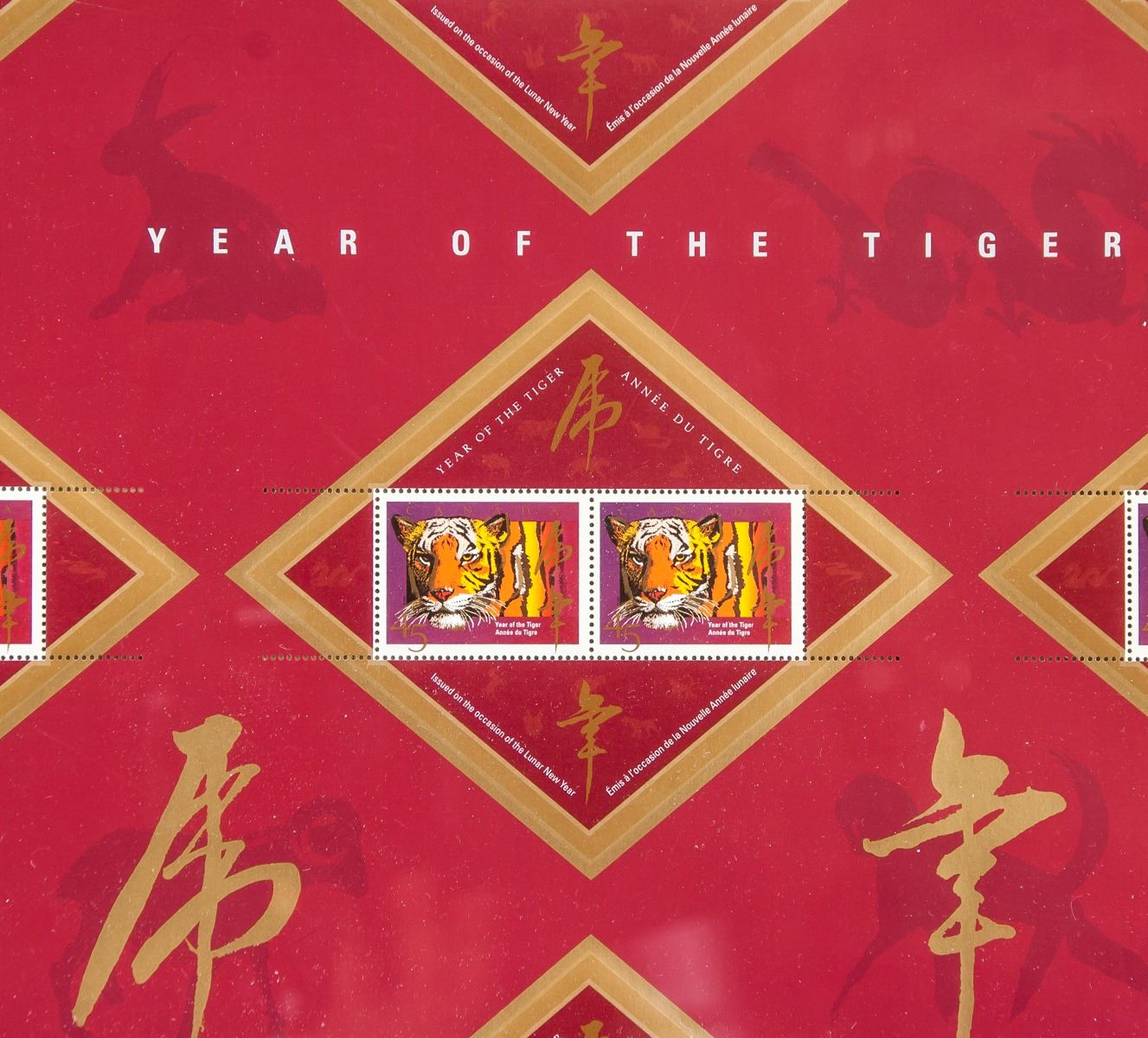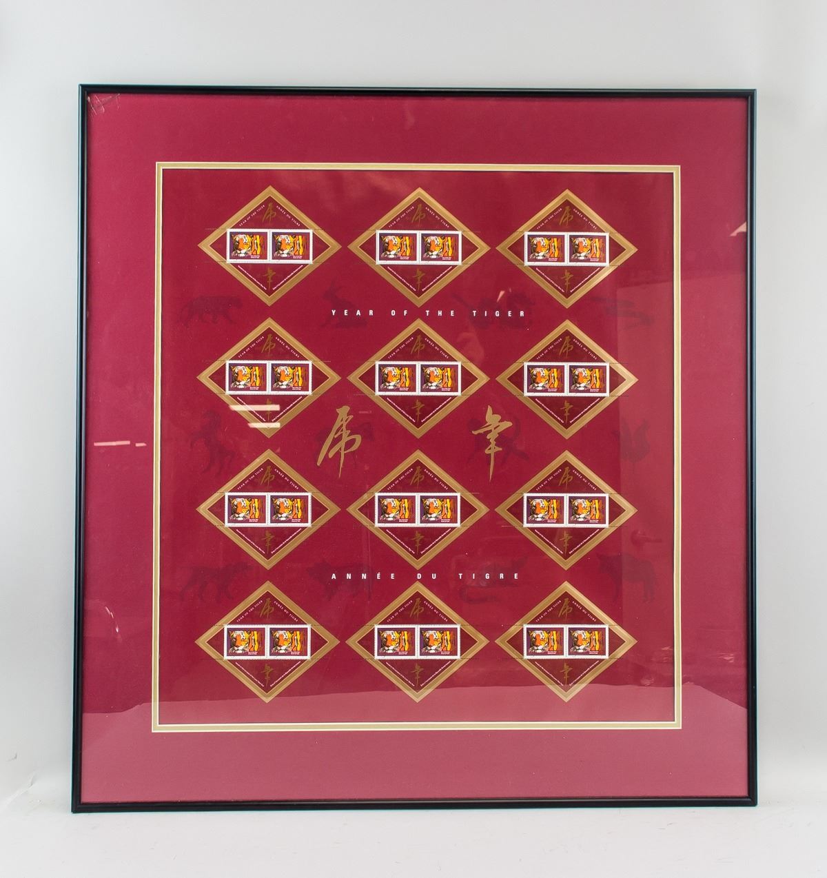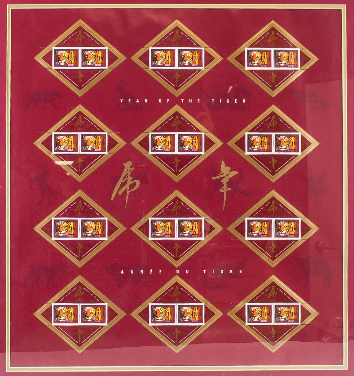 24 pieces 1998 Canadian 45 Cents stamps, featuring Chinese Lunar Year of Tiger, unused, framed, Framed size: 69 x 65 cm, stamp size: 3.3 x 4 each