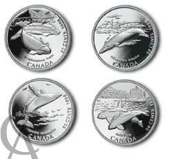 1998 Canada Whales (Ocean Giants) Sterling Silve Proof 4-coin 50-cent in original packaging however the outer cardboard is tattered.
