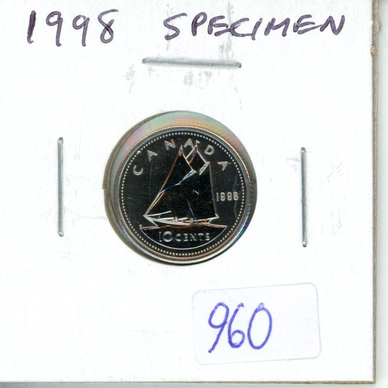 1998 Canadian Specimen 10 Cents. The special finish on the coin is a three-fold combination of brilliant and frosted relief on a lined finish background.