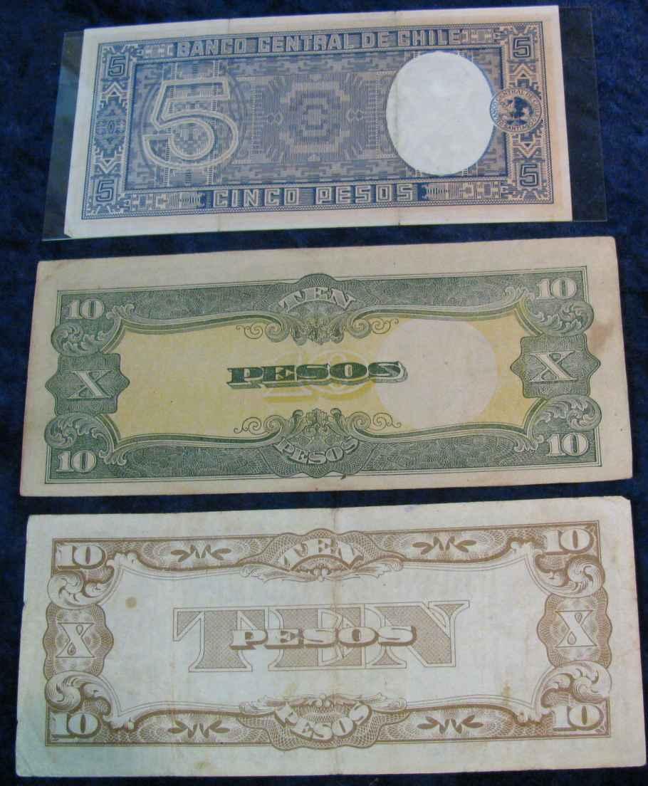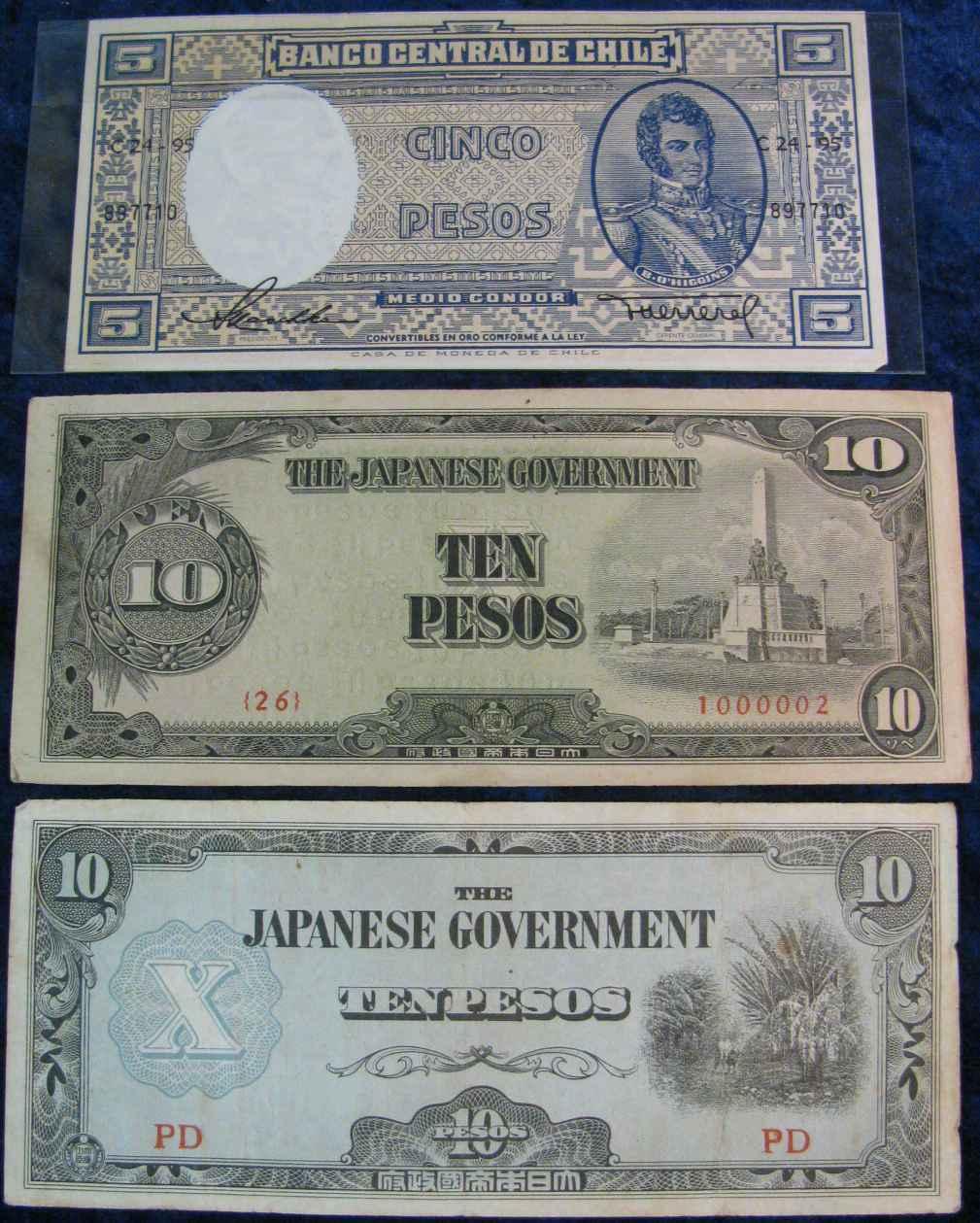 1998. Central Bank of Chile Five Peso Note; & (2) 10 Peso Japanese Notes used in WW II Philippines Islands.