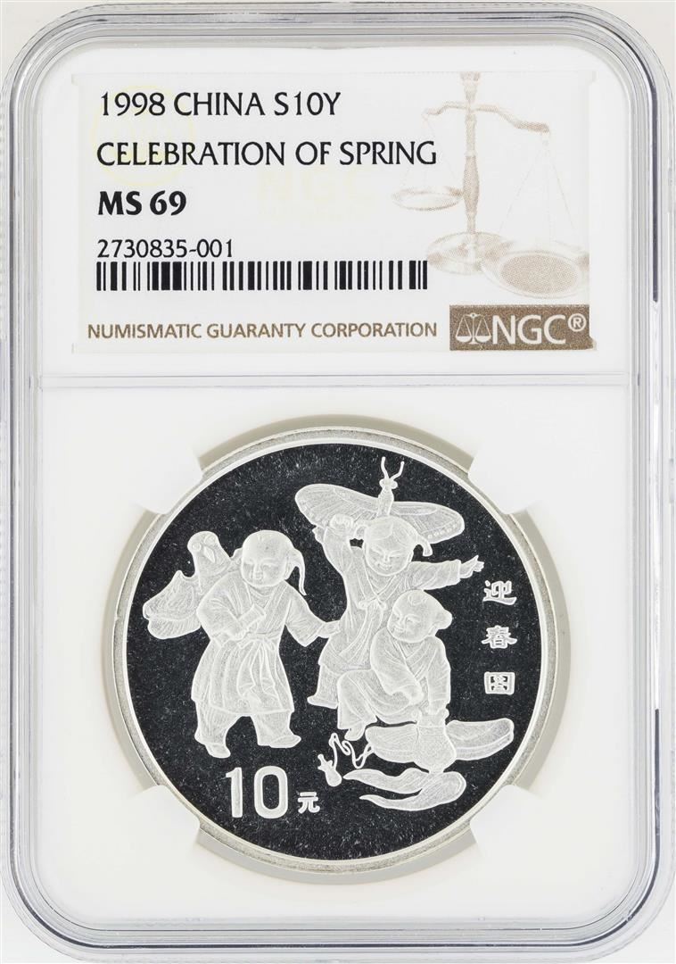One 1998 China 10 Yuan Celebration of Spring Silver Coin NGC MS69. NGC Certified.