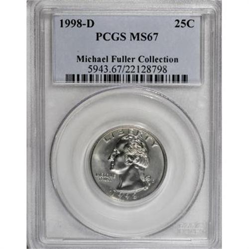 <B>1998-D 25C MS67 PCGS.</B></I> Michael Fuller Collection. PCGS Population (14/0). NGC Census: (3/0). Mintage: 821,000,000. (#5943)<BR><BR><B>Coin Engraver:</B> John Flanagan<BR><BR><b>Shipping:</b> Coins & Currency (<a target="_blank" href="http://www.heritageauctions.com/common/shipping.php">view shipping information</a>)