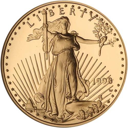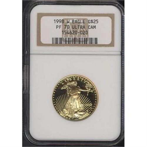 <b>1998 Gold Eagle $25. NGC graded PF70 UC.</b> Collector's Universe price: $2250. The otherwise golden-red color brightenes with the well frosted high points to give a spectacular two-tone "cameo" effect <b>(PCGS # 9936)</b>