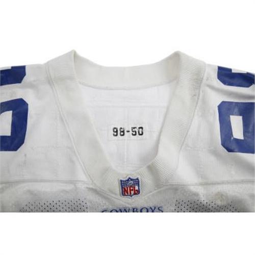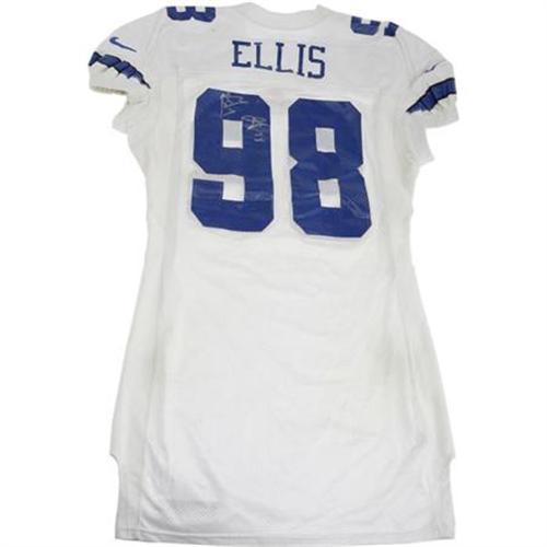 <B>1998 Greg Ellis Game Worn and Signed Jersey.</B></I> White mesh jersey from the 1998 rookie season of Dallas Cowboys defensive stalwart Greg Ellis. Classic white mesh home gamer has a blue stripe outlined in black appliqud directly to the sleeves, with the standard second stripe having been tailored off. Serifed name identifiers reading "ELLIS" affixed to rear nameplate. Exhibits outstanding wear, evidenced by numerous marks on front and chest numerals, rips and shoulder pad abrasion marks throughout. Team repairs also pepper this rookie jersey. Team alterations include Dallas Cowboys standard shoulder pad tie-down twill piece inside front of collar and sleeves that have been shortened and tapered to secure a snug fit. Tagging consists of "98-50" swatch at neck indicating year of issue and size and Nike manufacturer's tag in tail. Ellis has signed in silver sharpie on the rear numerals.<BR><BR><b>Shipping:</b> Requires 3rd Party Shipping (<a target="_blank" href="http://www.heritageauctions.com/common/shipping.php">view shipping information</a>)