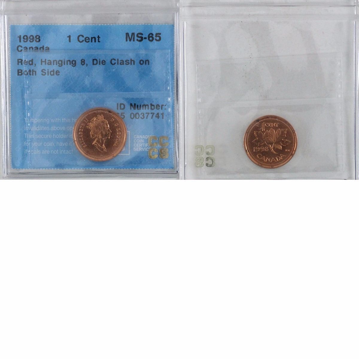 1998 Hanging 8, Die Clash on Both Side 1-cent CCCS Certified MS-65. Buyers Premium will be added on all items as per our terms of sale. We accept Paypal, Credit Card, E-Transfer Payments, Cheque or Money Orders (there is an additional 3% fee for using Paypal or Credit Card). All invoices will be emailed immediately following the auction, please contact us if you would like to pay by credit card or receive a new revised lower total for mailing in payment or sending an e-transfer (3% discount). All Items Are Sold "AS IS", no returns