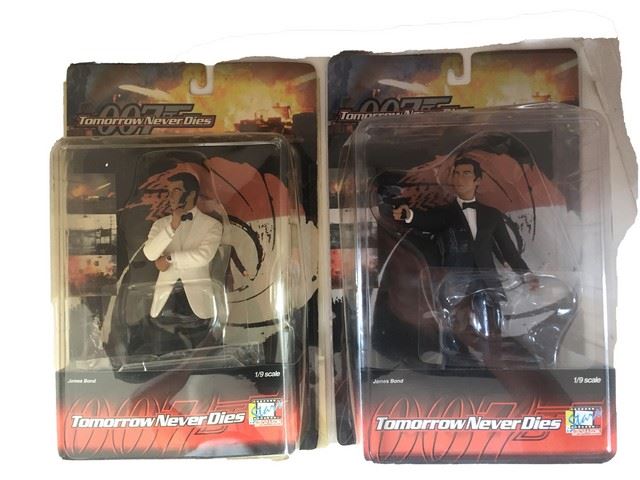 James Bond 007 Tomorrow Never Dies set of 2 1/9 scale collectible action figures featuring James Bond in a black tuxedo and James Bond in a white tuxedo jacket with black pants. Dragon Models Ltd., 1998. New in package. Good condition. Plastic has yellowed and curled over time (13"x9")