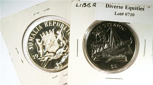 Two coins featuring the sinking of the RMS Titanic,1912. 1998 Liberia $5 BU and Somalia Republic $5 Proof with heavy cameo, no return.