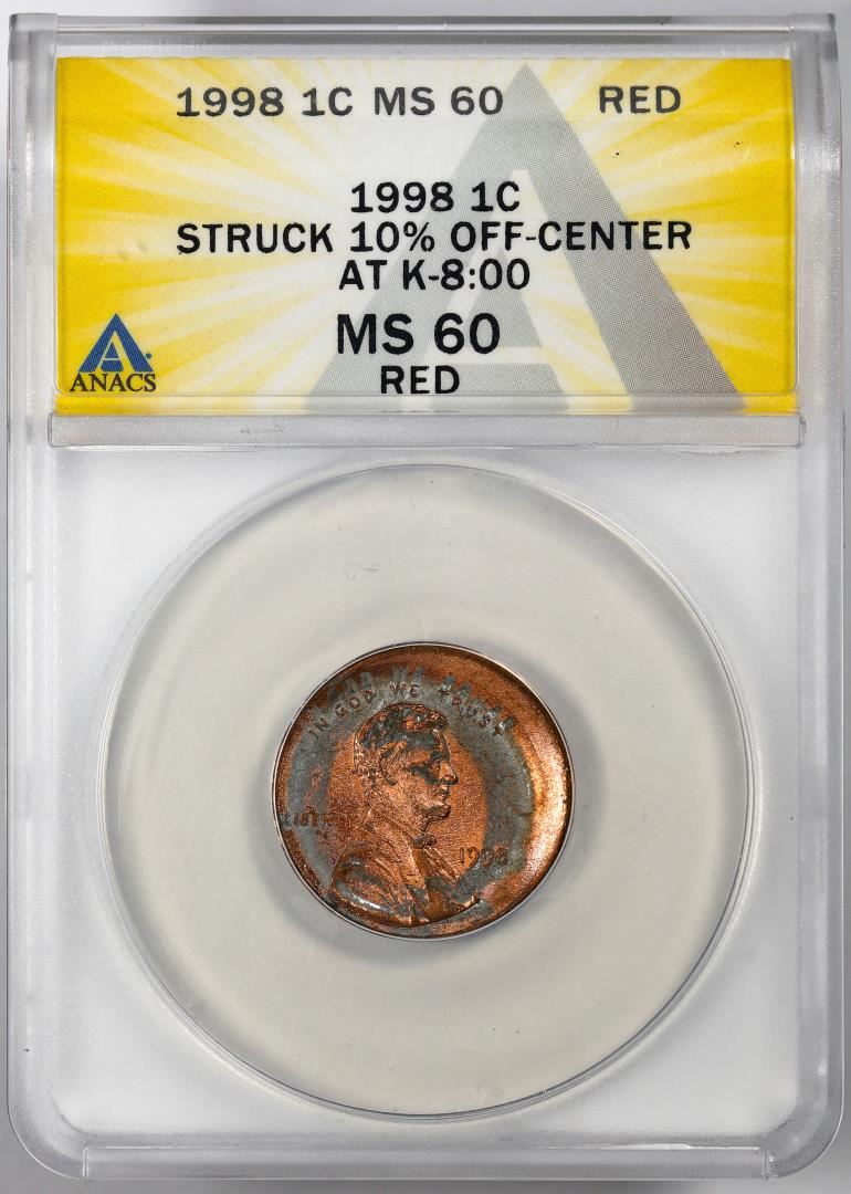 One 1998 Lincoln Memorial Cent Coin Error Struck 10% Off Center @ K-8:00 ANACS MS60 RED. ANACS Certified.