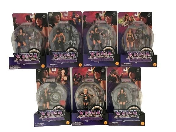 Lot of 7 Xena Warrior Princess 6" action figures from Toy Biz (1998). Included is Xena Warrior Princess: A Day in the Life with jumping attack action, Xena: Sins of the Past with sword drawing action (2 of them with different positions in the box), Callisto with spinning attack action, Gabrielle: Orphan of War with a spinning staff attack, Amazon Warrior Velasca with tribal mask, Harem Xena with Pillar of Power and Ambrosia Cave from the Xena Warrior Princess action figure line segment from Toy Biz as well (1998). All packages are in near mint condition. All items come direct from the collection of the western chairman of Xena Warrior Princess' official fan club.