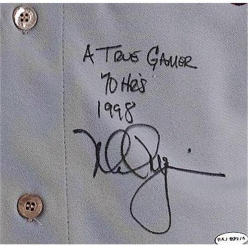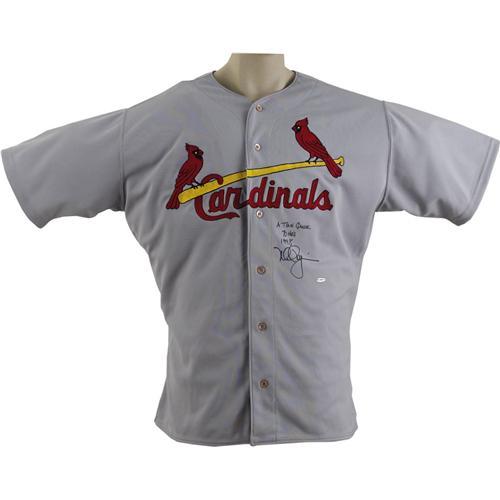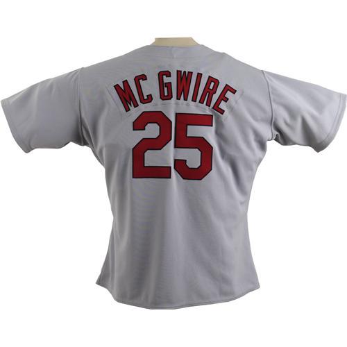 <B>1998 Mark McGwire Game Worn Uniform.</B></I> To those who believe that Big Mac's accomplishments in 1998 were somehow diminished by those of Bonds in 2001, we must respectfully disagree. Though McGwire's record was still in diapers when it was felled by Barry, the latter never captured the imagination of the baseball world the way the Sosa - McGwire chase of '98 did. Just like the Babe "saved" baseball after the Black Sox scandal with his thunderous bat, so did the Cardinals slugger after the sport took a big hit from the 1994 strike. It was McGwire who chipped through the hard shell of cynicism that was left behind by the cancelled season and let us look upon the game again with new eyes. While a handful of jerseys from that special season have found their way to the auction block, it's particularly rare to find a shirt with the matching pants, as we have here. The combination offers a greatly heightened opportunity for display, and we would expect that the winning bidder would be shopping for a mannequin as soon as the hammer falls. The shirt offers the most attractive of all baseball logos, with the chenille birds and bat rising above the classically scripted "Cardinals" on the chest. "McGwire 25" is sewn in red and navy tackle twill on verso. Just above the custom-shortened inner tail is the proper "Rawlings" label with "52" and "Set 1 1998" flap tags affixed. An Upper Deck authenticated inscription, complete with holographic sticker and paperwork, appears on lower chest, reading, "A True Gamer, 70 HR's, 1998, Mark McGwire" in 10/10 black sharpie. The matching pants offer the same "Rawlings" label beside a machine embroidered swatch that reads, "McGwire 25 36-39 37 98." Both pieces show wear that makes us wonder, how many trips around the bases did they take? After all, with McGwire hitting a home run in almost every other game, there is virtually no chance that this uniform could be a long ball virgin. Don't worry too much if you miss out on this one though -- you can always peer at one just like it through plexiglass in Cooperstown. <I>LOA from Lou Lampson. LOA from Upper Deck.</B></I> <BR><BR><B>Important notice:</B> Heritage usually auctions material at the rate of 200-250 lots per hour. On some occasions eBay Live bid software or the Internet may not be able to keep up with the pace of the auction. We recommend placing a realistic absentee bid now as insurance to avoid disappointment. Occasionally the auctioneer may eliminate or reject an eBay Live bid, and the auctioneer may also reopen a lot after the close of the eBay live bidding (usually because we missed an audience bid), and may reject your bid even if it shows you as the winning bidder. By bidding via eBay Live, you agree that Heritage may award the lot to another bidder at its sole discretion under the circumstances described above or any other reasonable circumstances. Since eBay bids are not shown to us until we open the lot on the floor, we treat those bids just like floor bids. In most cases the floor responds before the eBay bid is presented to us, due to Internet lag time, so for consistency we have made it a policy that floor bids are always considered first over tie eBay live bids. Also please note that all Heritage lots purchased through eBay Live carry a 22.5% Buyer's Premium. Please make sure you read the Terms and Conditions before you bid. This lot is being auctioned in conjunction with a live floor auction by Heritage Galleries & Auctioneers. All final auction and invoice information will be supplied by Heritage Galleries & Auctioneers, and all other information should be considered preliminary. Lot:19673 <BR><BR><B>Winning Notification and Billing:</B> After the FINAL session in this auction is complete, Heritage will send e-mail and snail mail invoices. This process normally takes several days. All final auction and invoice information will be supplied by Heritage Galleries & Auctioneers, and all other information should be considered preliminary. <BR><BR>This auction will be conducted on a live auction floor and over the Internet through eBay Live. If you choose to place an absentee bid, please take a moment to <font color='#0000ff'><u><a href='http://pages.ebay.com/liveauctions/help/before/laabsentee.html'>learn how eBay Live absentee bidding works</a></u></font><font color='#000000'>