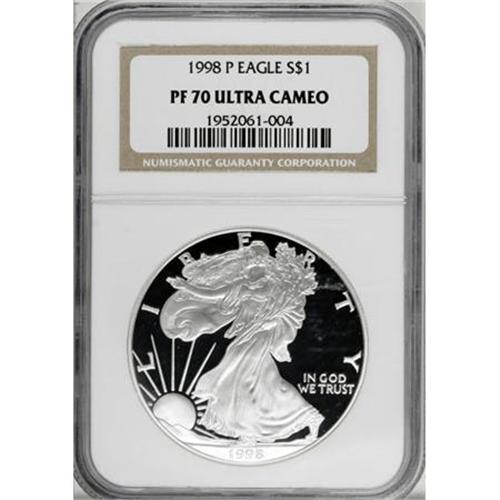 <B>1998-P $1 Silver Eagle PR70 Deep Cameo NGC.</B></I> NGC Census: (736/0). PCGS Population (87/0). Numismedia Wsl. Price for NGC/PCGS coin in PR70: $380. (#9930)<BR><BR><b>Shipping:</b> Coins & Currency (<a target="_blank" href="http://www.heritageauctions.com/common/shipping.php">view shipping information</a>)