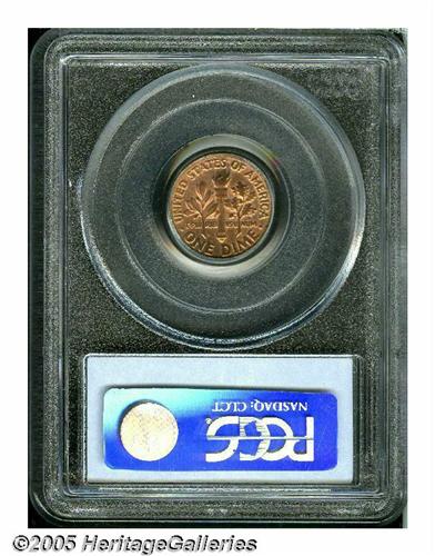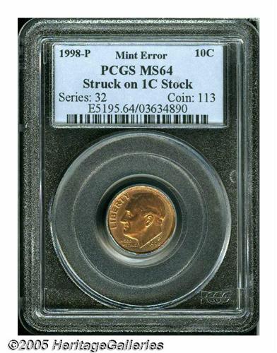 <B>1998-P<10C> Roosevelt Dime--Struck on 1C Stock--MS64 PCGS.</B></I> Although PCGS has not recorded a color designation on the insert, the orange-red color approaches full Red. An impressively preserved near-Gem with a bold strike and good luster. A tiny lamination (as made) rests above the second U in UNUM. An uncommon error that was apparently struck on a Dime-sized planchet cut from Cent stock, as a larger Cent planchet would presumably not fit between the Dime dies.<BR><I>From The Tom Mershon Collection.</B></I>