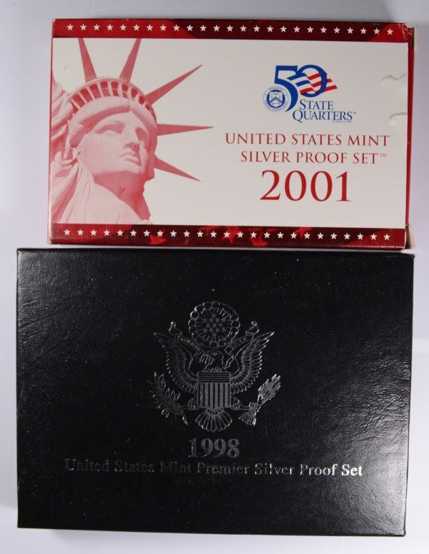 1998 PREMIER SILVER PROOF SET AND 2001 SILVER PROOF SET IN ORIG PACKAGING, GEMS