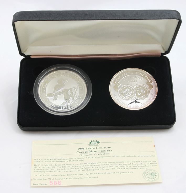 1998 Perth Mint 2oz Kookaburra & 2oz NCSS Perth Coin Show Medallion in case of issue with certificate