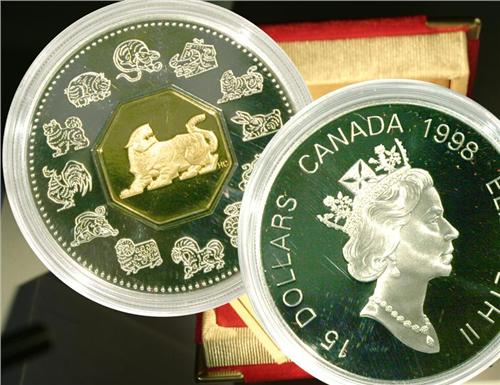 The Scarce, every popular sought after coin in the series. First in the series of 12 coins to be released by the Royal Canadian Mint, one annually to commemorate Chinese astrology with each individual coin featuring an animal symbol based on the Lunar Calendar. Coin is 92.5% silver and 7.5% copper, 40mm in diameter with a weight of 34gms. Features a central octagonal cameo plated in 24kt gold with design of Tiger. In original plush red case with certificate.
