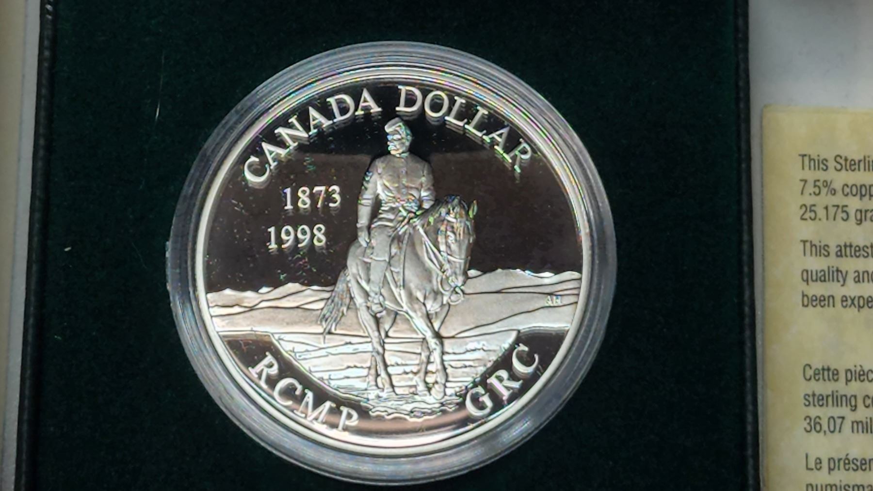 1998 RCMP Silver Dollar. 125th Anniversary of the founding of the NWMP. Proof with Ultra Heavy Cameo. Housed in its original case & box of issue.