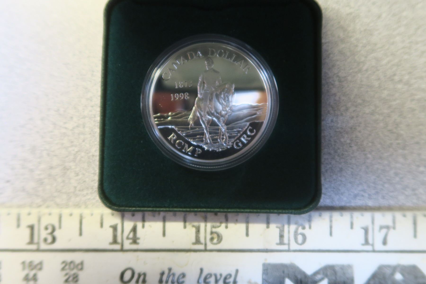 1998 RCMP Silver Dollar. 125th Anniversary of the founding of the NWMP, now called the RCMP. Housed in its original case of issue. Proof with Ultra Heavy Cameo. Bright White.