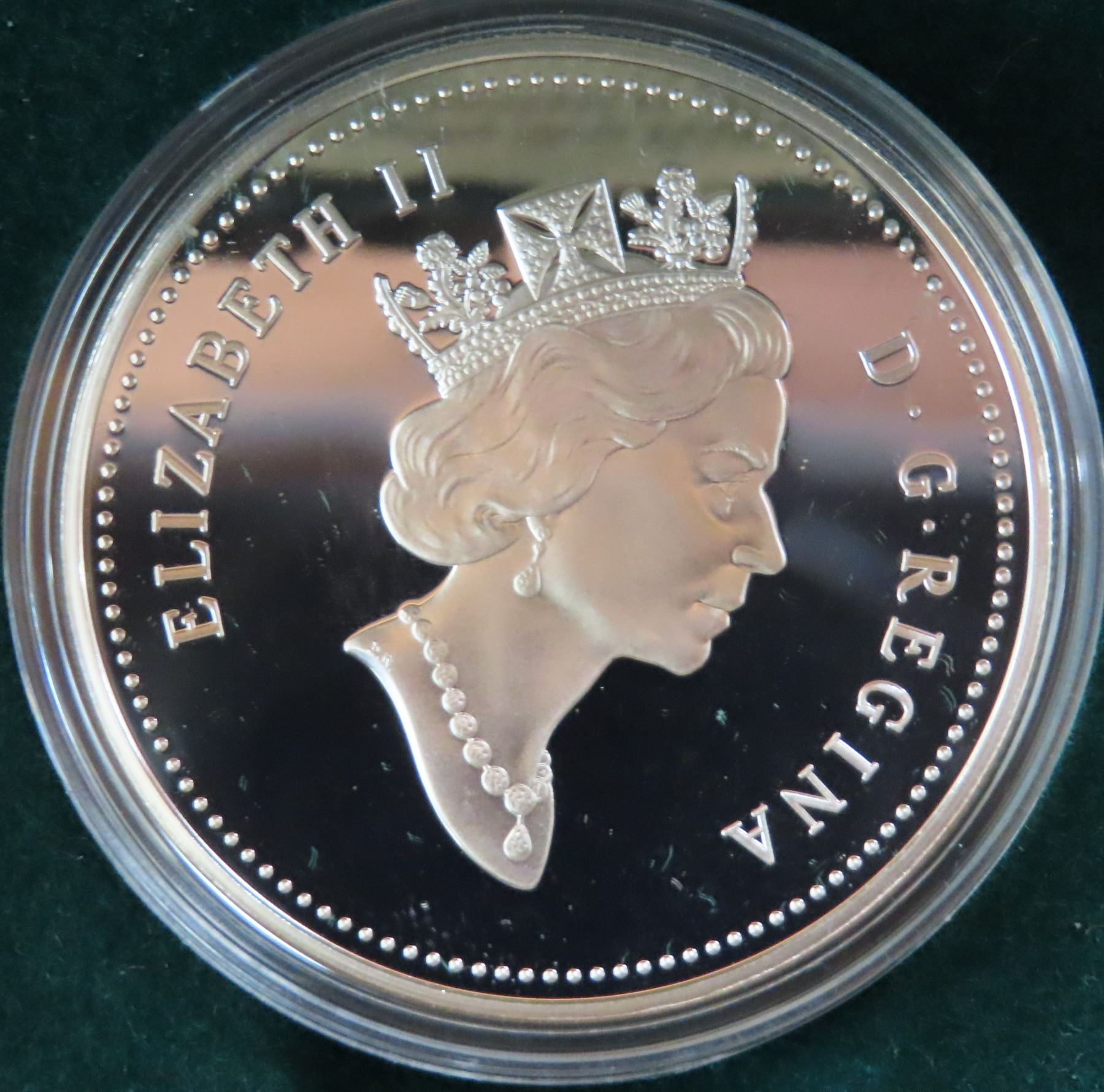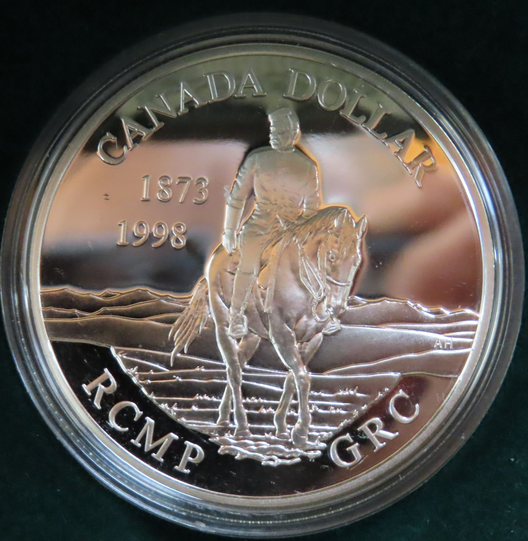 1998 RCMP Silver Dollar. 125th Anniversary of the founding of the RCMP. Proof with Ultra Heavy Cameo. Bright White. Housed in its original case of issue.