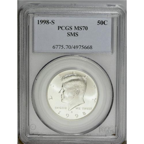 <B>1998-S<50C> SMS MS70 PCGS.</B></I> The unrivaled king of the Kennedy series, this example is perfect, with shimmering, awe-inspiring mint bloom. The best of the best.<BR><I>From The J. S. Hamilton Registry Set of Proof Kennedy Half Dollars.</B></I> <BR><BR><B>Important notice:</B> Heritage usually auctions material at the rate of 200-250 lots per hour. On some occasions eBay Live bid software or the Internet may not be able to keep up with the pace of the auction. We recommend placing a realistic absentee bid now as insurance to avoid disappointment. Occasionally the auctioneer may eliminate or reject an eBay Live bid, and the auctioneer may also reopen a lot after the close of the eBay live bidding (usually because we missed an audience bid), and may reject your bid even if it shows you as the winning bidder. By bidding via eBay Live, you agree that Heritage may award the lot to another bidder at its sole discretion under the circumstances described above or any other reasonable circumstances. Since eBay bids are not shown to us until we open the lot on the floor, we treat those bids just like floor bids. In most cases the floor responds before the eBay bid is presented to us, due to Internet lag time, so for consistency we have made it a policy that floor bids are always considered first over tie eBay live bids. Also please note that all Heritage lots purchased through eBay Live carry a 20% Buyer's Premium. Please make sure you read the Terms and Conditions before you bid. This lot is being auctioned in conjunction with a live floor auction by Heritage Galleries & Auctioneers. All final auction and invoice information will be supplied by Heritage Galleries & Auctioneers, and all other information should be considered preliminary. Lot:3169 <BR><BR><B>Winning Notification and Billing:</B> After the FINAL session in this auction is complete, Heritage will send e-mail and snail mail invoices. This process normally takes several days. All final auction and invoice information will be supplied by Heritage Galleries & Auctioneers, and all other information should be considered preliminary. <BR><BR>This auction will be conducted on a live auction floor and over the Internet through eBay Live. If you choose to place an absentee bid, please take a moment to <font color='#0000ff'><u><a href='http://pages.ebay.com/liveauctions/help/before/laabsentee.html'>learn how eBay Live absentee bidding works</a></u></font><font color='#000000'>