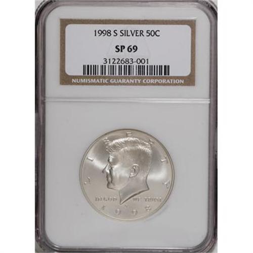 <B>1998-S 50C SMS MS69 NGC.</B></I> . NGC Census: (643/205). PCGS Population (1447/151). Numismedia Wsl. Price for NGC/PCGS coin in MS69: $240. (#6775)<BR><BR><B>Coin Engraver:</B> Gilroy Roberts and Frank Gasparro<BR><BR><b>Shipping:</b> Coins & Currency (<a target="_blank" href="http://www.heritageauctions.com/common/shipping.php">view shipping information</a>)