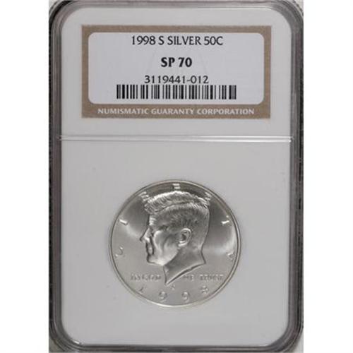 <B>1998-S 50C SMS MS70 NGC.</B></I> . NGC Census: (205/0). PCGS Population (151/0). Numismedia Wsl. Price for NGC/PCGS coin in MS70: $625. (#6775)<BR><BR><B>Coin Engraver:</B> Gilroy Roberts and Frank Gasparro<BR><BR><b>Shipping:</b> Coins & Currency (<a target="_blank" href="http://www.heritageauctions.com/common/shipping.php">view shipping information</a>)