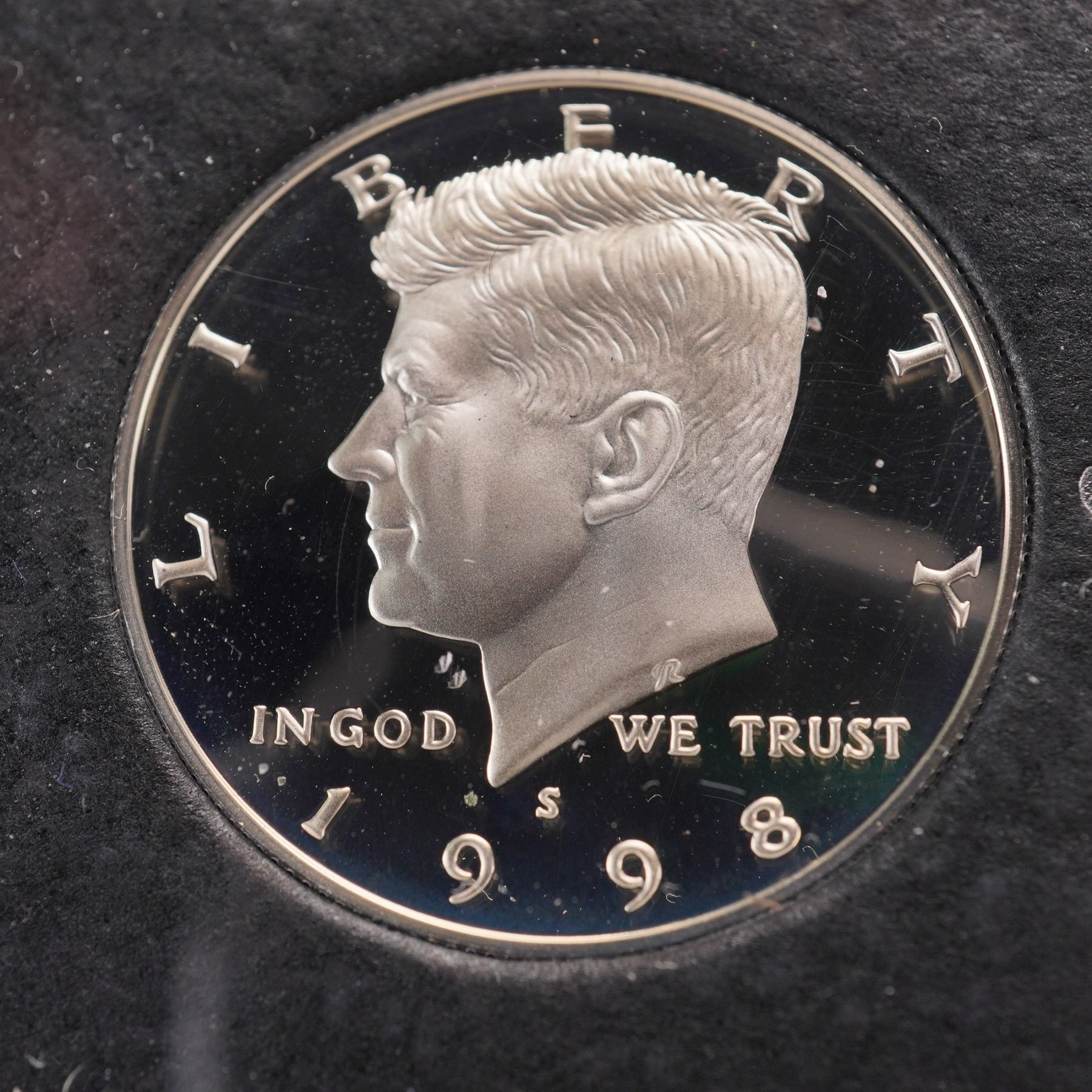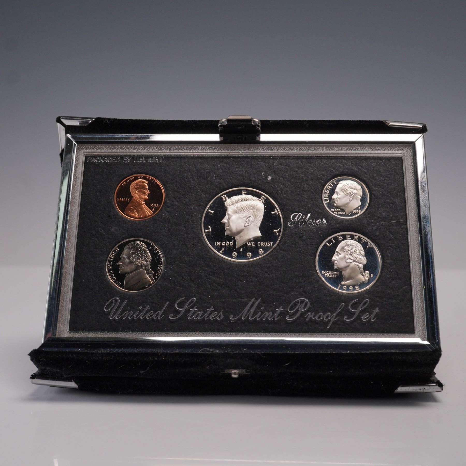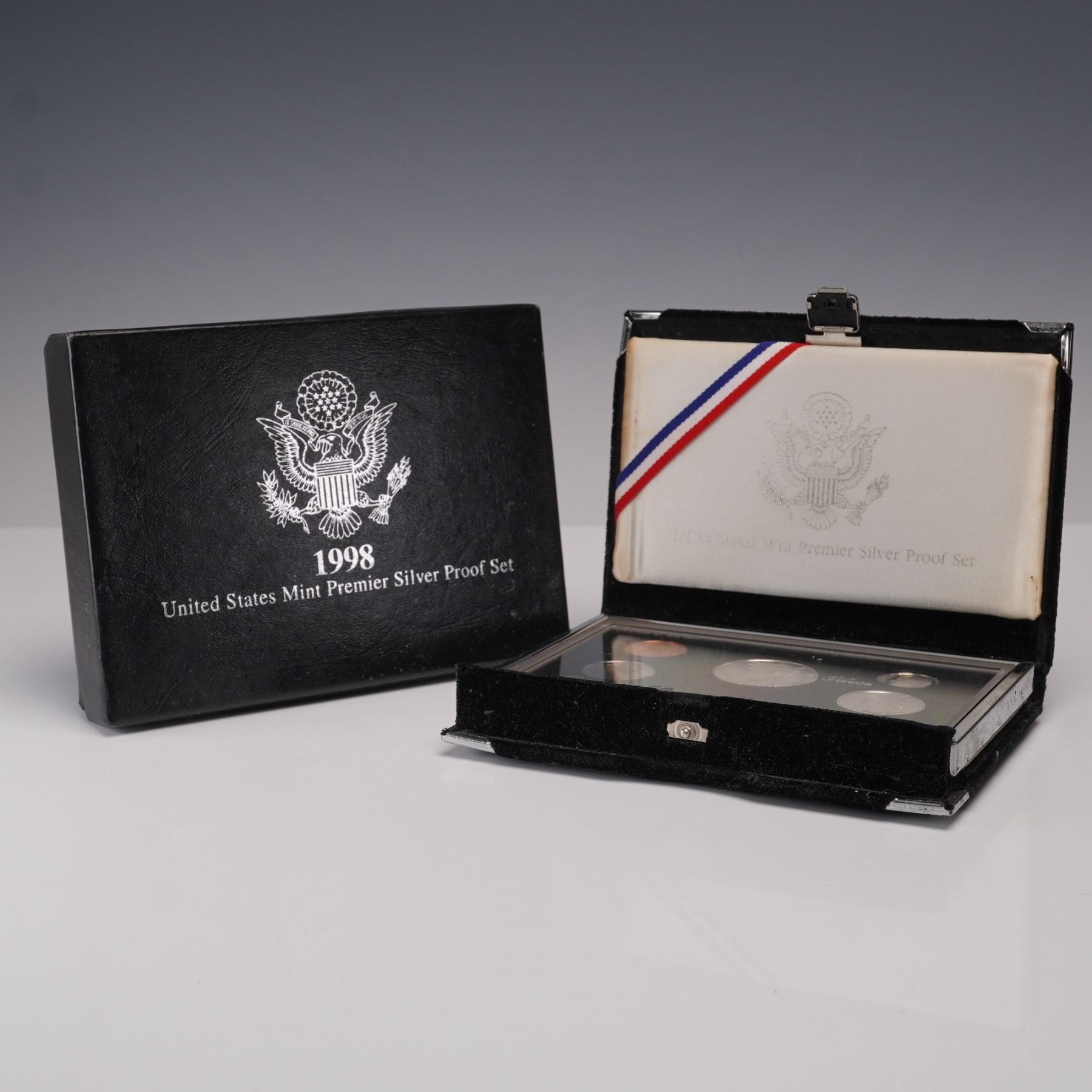 A 1998-S United States Mint Premier Silver Proof Set, housed in its original display case and outer box. This complete five-coin set features a Kennedy Half Dollar, Washington Quarter, and Roosevelt Dime, each struck in 90% silver. The set also includes a Lincoln Cent and a Jefferson Nickel, all bearing the "S" mint mark of the San Francisco Mint. The coins are encapsulated in a hard plastic case, mounted in a black velvet folder with silver-toned accents and the U.S. Great Seal emblem. Accompanying the set is the official black outer box marked "1998 United States Mint Premier Silver Proof Set." The inner case also features the United States Mint logo and a white satin lining with red, white, and blue ribbon detail. This set represents a high-quality proof issue, created with precision die strikes and mirrored finishes to highlight each coin's design. Box: 6.25"L x 4.5"W x 1.25"H. Case: 5.75"L x 4"W x 1"H.