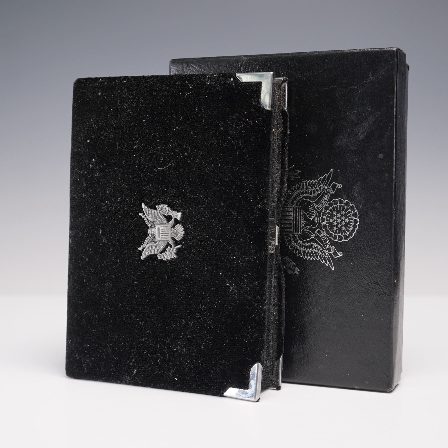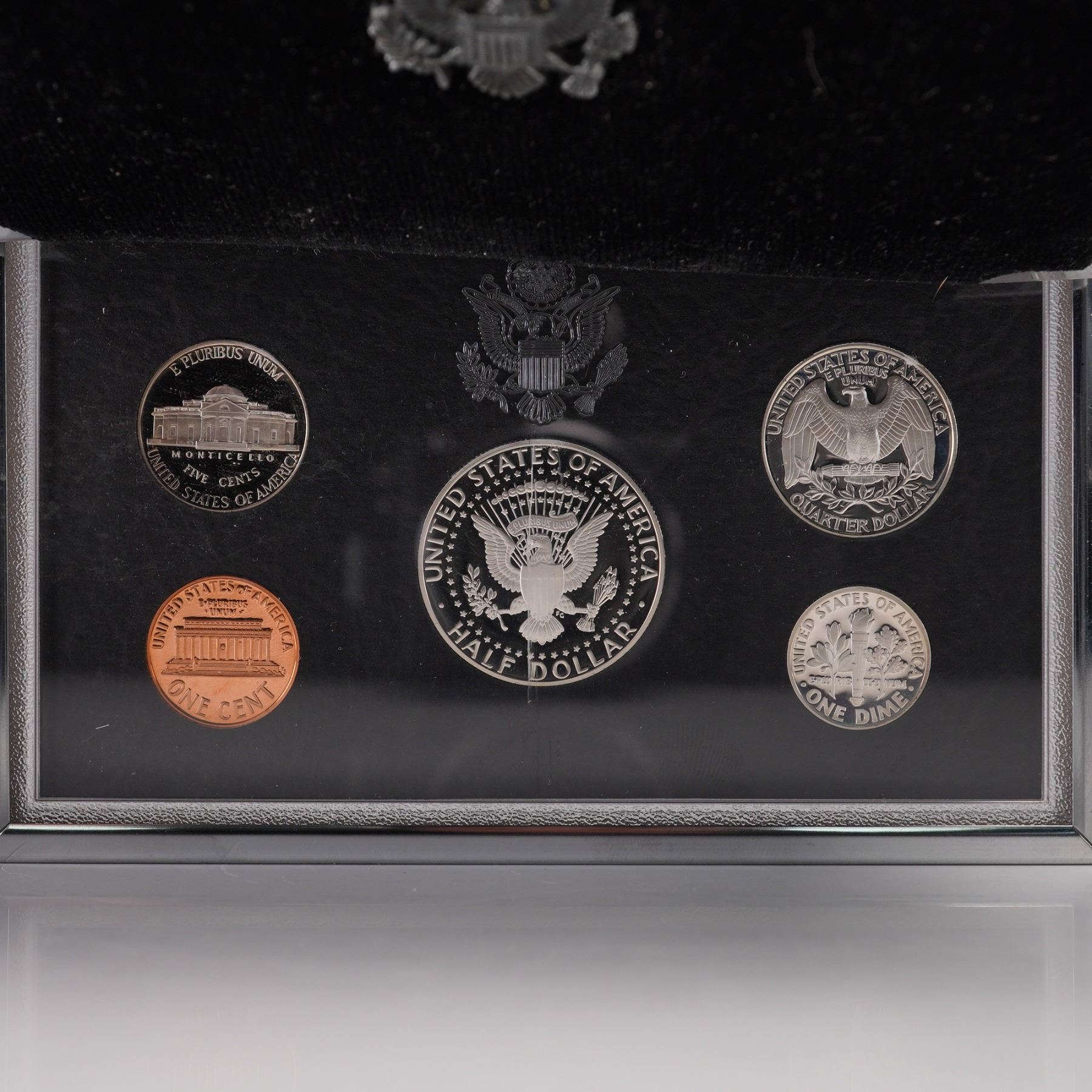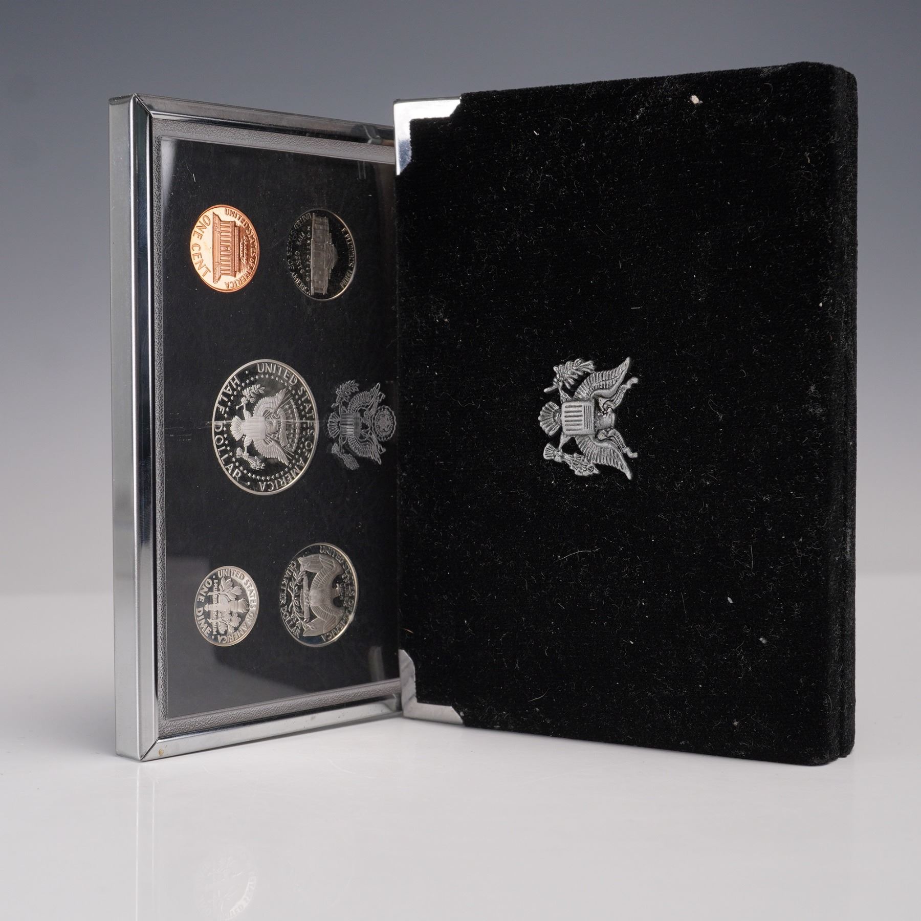 A 1998-S United States Mint Premier Silver Proof Set, housed in its original display case and outer box. This complete five-coin set features a Kennedy Half Dollar, Washington Quarter, and Roosevelt Dime, each struck in 90% silver. The set also includes a Lincoln Cent and a Jefferson Nickel, all bearing the "S" mint mark of the San Francisco Mint. The coins are encapsulated in a hard plastic case, mounted in a black velvet folder with silver-toned accents and the U.S. Great Seal emblem. Accompanying the set is the official black outer box marked "1998 United States Mint Premier Silver Proof Set." The inner case also features the United States Mint logo and a white satin lining with red, white, and blue ribbon detail. This set represents a high-quality proof issue, created with precision die strikes and mirrored finishes to highlight each coin's design. Box: 6.25"L x 4.5"W x 1.25"H. Case: 5.75"L x 4"W x 1"H.