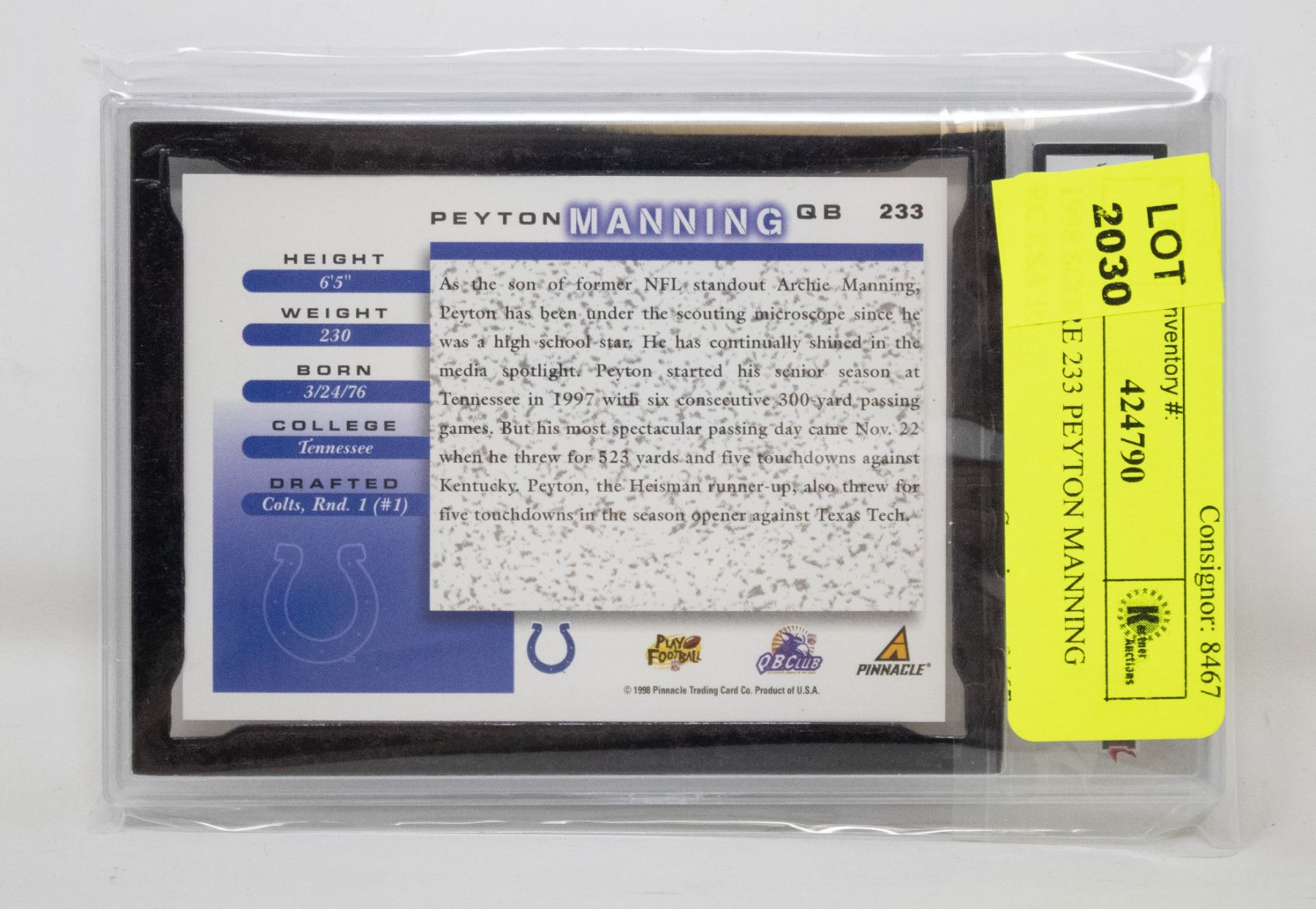BETWEEN PSA AND BGS A TOTAL OF 163 TENS EXIST. PEYTON MANNING ELECTED TO THE NFL ALL-DECADE TEAM, AND THE NFL 100TH ANNIVERSARY ALL-TIME TEAM. *ALL BIDS SUBJECT TO BANK BAILIFF OR OWNERS APPROVAL*