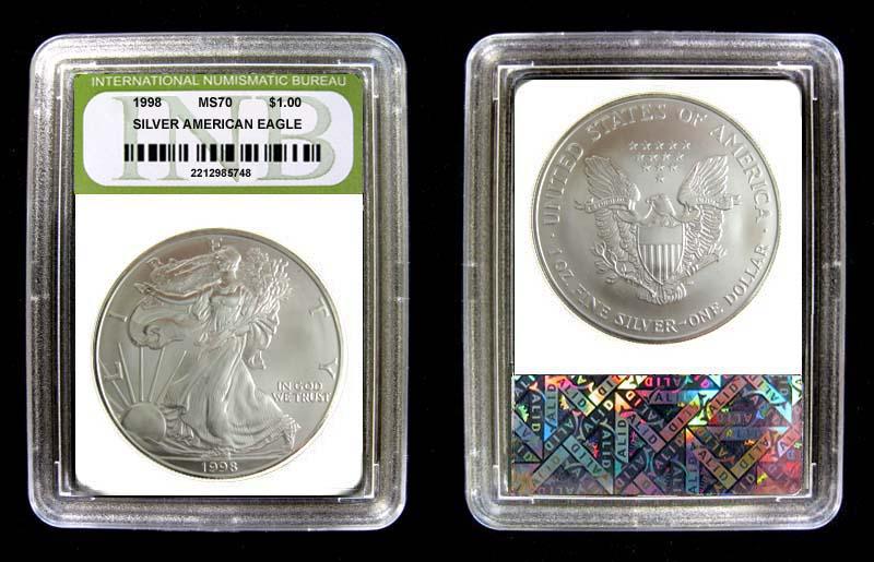 1998 SLABBED SILVER AMERICAN EAGLE HIGHEST GRADE INB GRADED MS70 - You may not receive the exact coin shown, but you will receive one of the same or better quality.