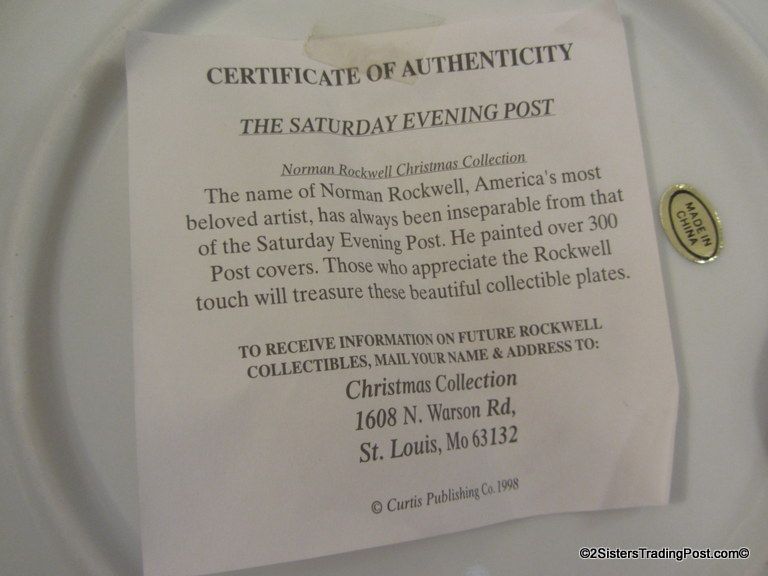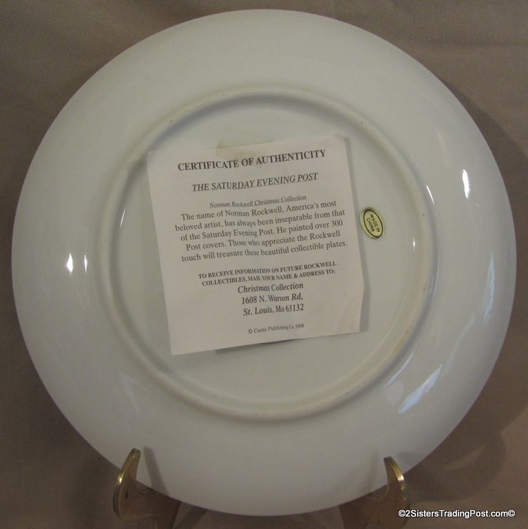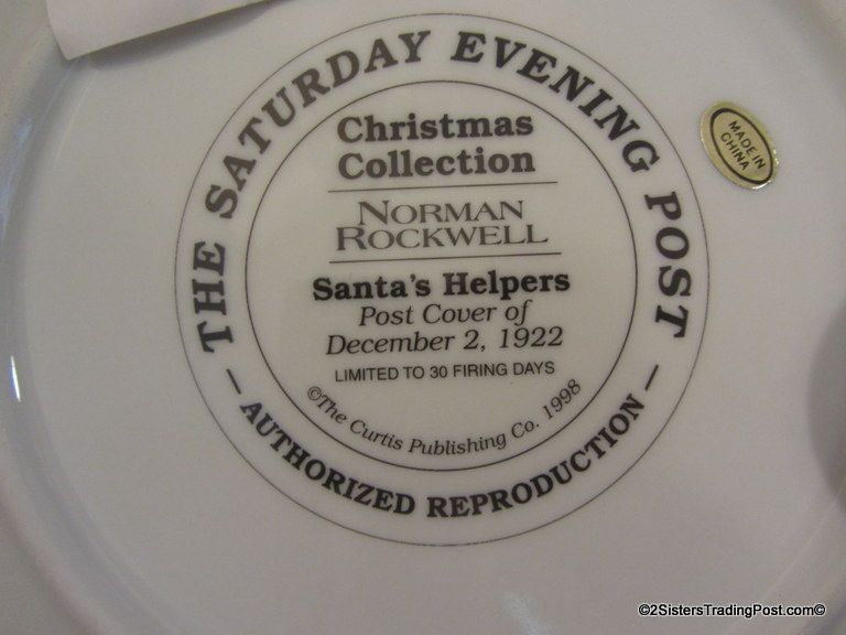 8" plate, dated 1998 'Santa's Helpers' the plate is trimmed in gold and is an authorized reproduction of The Saturday Evening Post Cover dated December 2, 1922 by Norman Rockwell. The plate is offered by The Curtis Publishin Co. as part of the Norman Rockwell Christmas Collection. Does not come in original box, COA is attached to the back of plate. (Please see images for details)