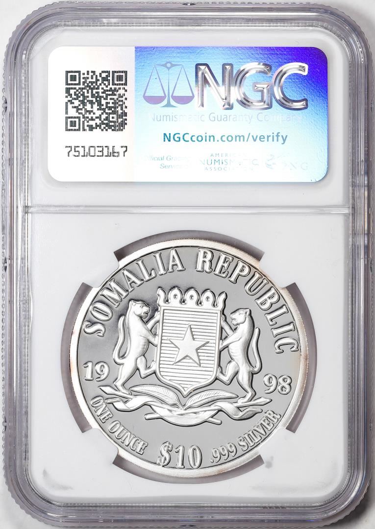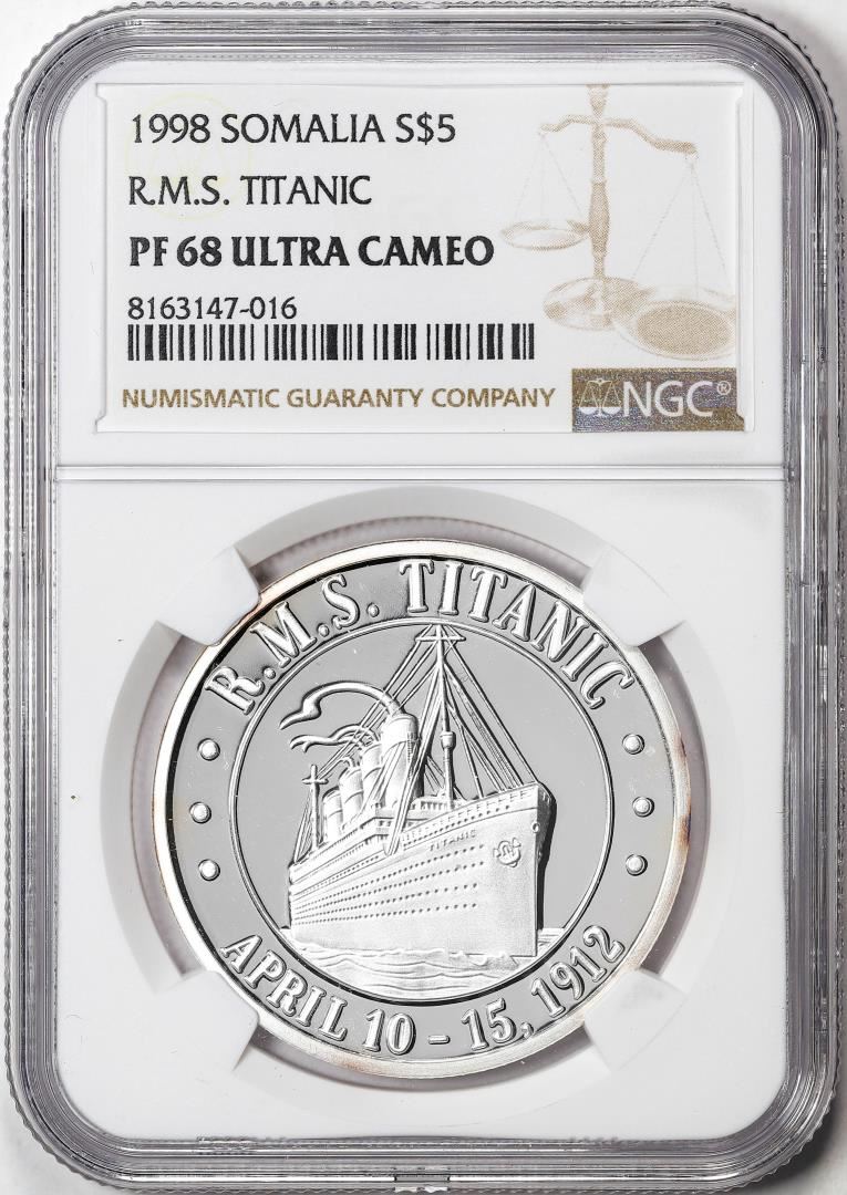 One 1998 Somalia $5 Proof R.M.S. Titanic Silver Coin NGC PF68 Ultra Cameo. NGC Certified.