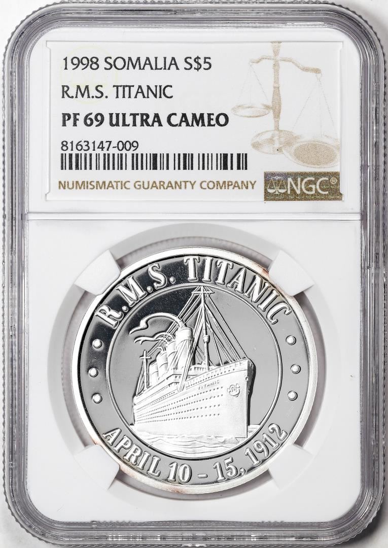 One 1998 Somalia $5 Proof R.M.S. Titanic Silver Coin NGC PF69 Ultra Cameo. NGC Certified.