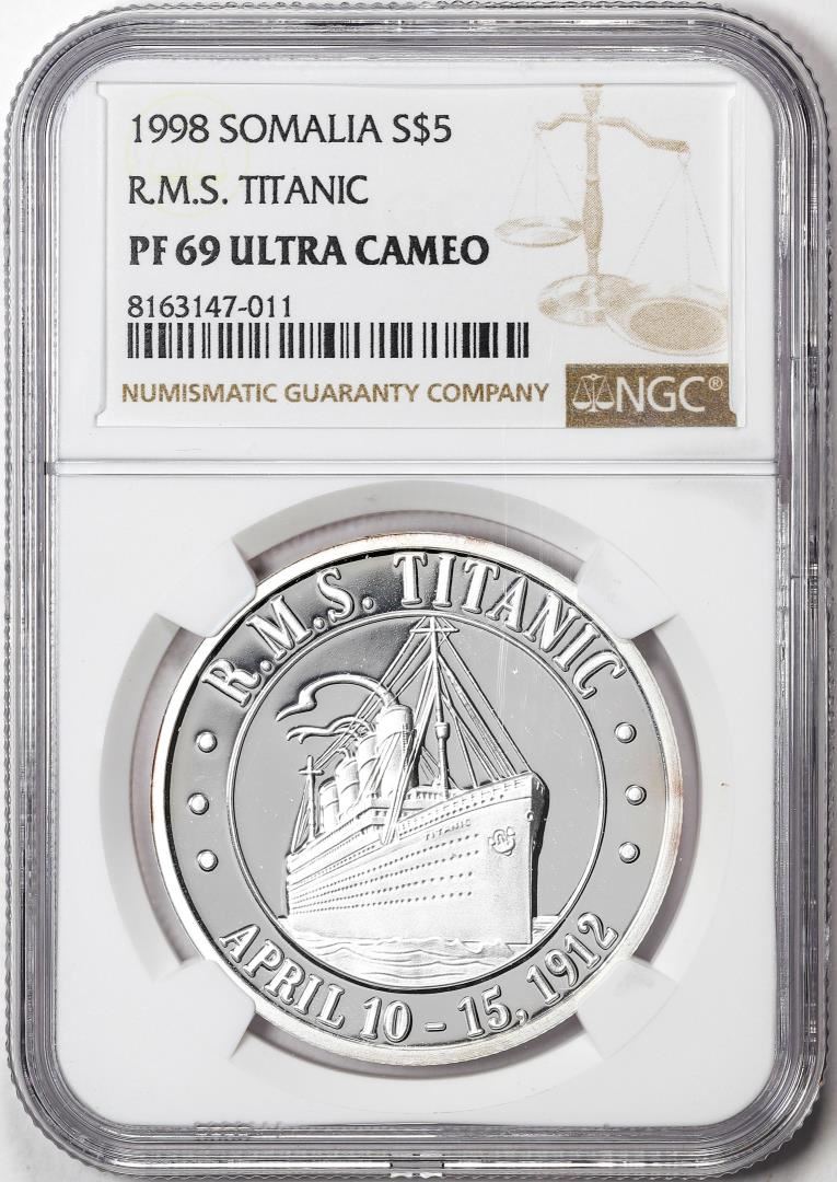 One 1998 Somalia $5 Proof R.M.S. Titanic Silver Coin NGC PF69 Ultra Cameo. NGC Certified.