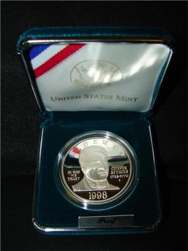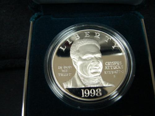 1998 U.S. MINT BLACK REVOLUTIONARY WAR PATRIOTS COMMEMORATIVE PROOF SILVER DOLLAR. Coin is in case with box.