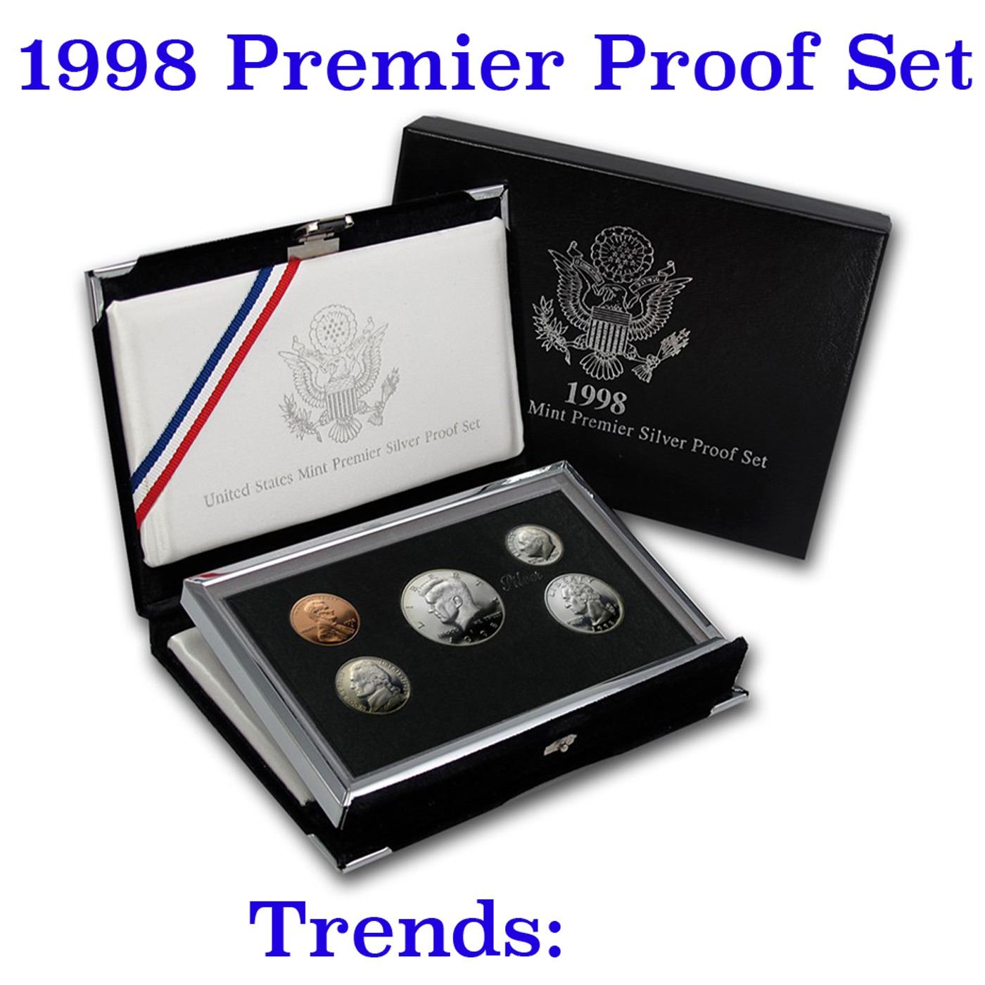 1998 United States Mint Premier Silver Proof Set in Display case 5 coins Grades. A dynamite Mint Issued Set. Attractively packaged in a self standing case. Very PQ packaging. This set contains a 90% silver Half Dollar, a 90% Silver Quarter and a 90% Silver Dime. Also all 5 pieces are Deep Cameo. Over 0.5 Oz of Pure Silver