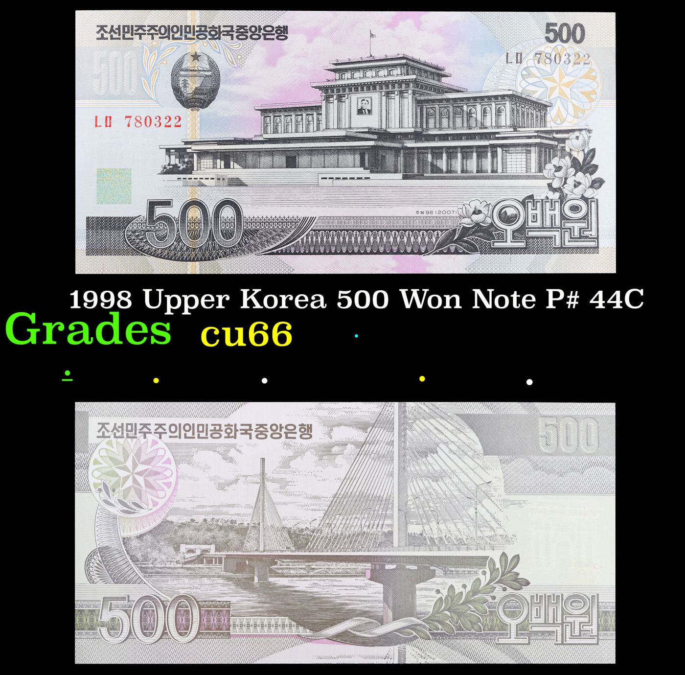 1998 Upper Korea 500 Won Note P# 44C Grades Gem+ CU.