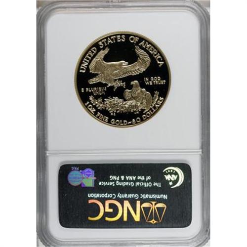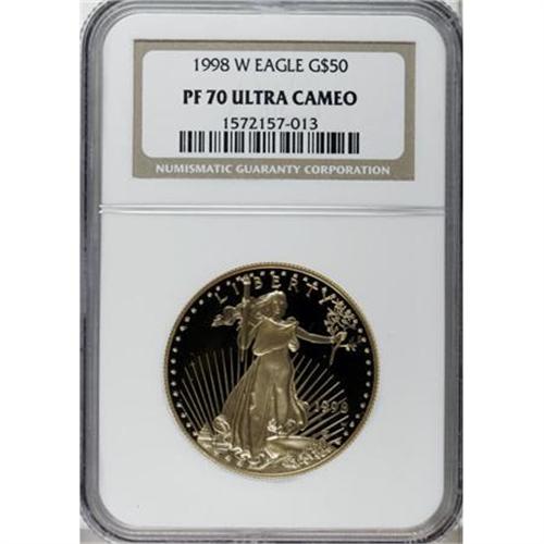 <B>1998-W G$50 One-Ounce Gold Eagle PR70 Deep Cameo NGC.</B></I> NGC Census: (214/0). PCGS Population (23/0). Numismedia Wsl. Price for NGC/PCGS coin in PR70: $2,050. (#9938)<BR><BR><b>Shipping:</b> Coins & Currency (<a target="_blank" href="http://www.heritageauctions.com/common/shipping.php">view shipping information</a>)