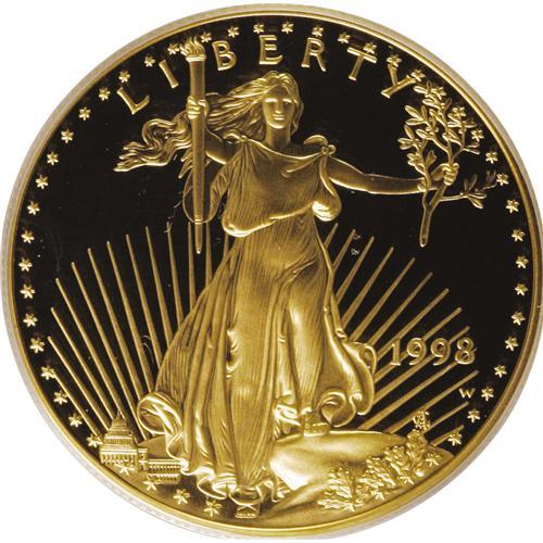 <B>1998-W G$50 One-Ounce Gold Eagle PR69 Deep Cameo PCGS.</B></I> PCGS Population (593/10). NGC Census: (384/124). Numismedia Wsl. Price: $900. (#9938)<BR><BR><b>Shipping:</b> Coins & Currency (<a target="_blank" href="http://www.heritageauctions.com/common/shipping.php">view shipping information</a>)