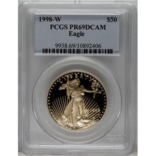 <B>1998-W G$50 One-Ounce Gold Eagle PR69 Deep Cameo PCGS.</B></I> PCGS Population (593/10). NGC Census: (412/142). Numismedia Wsl. Price: $900. (#9938)<BR><BR><b>Shipping:</b> Coins & Currency (<a target="_blank" href="http://www.heritageauctions.com/common/shipping.php">view shipping information</a>)